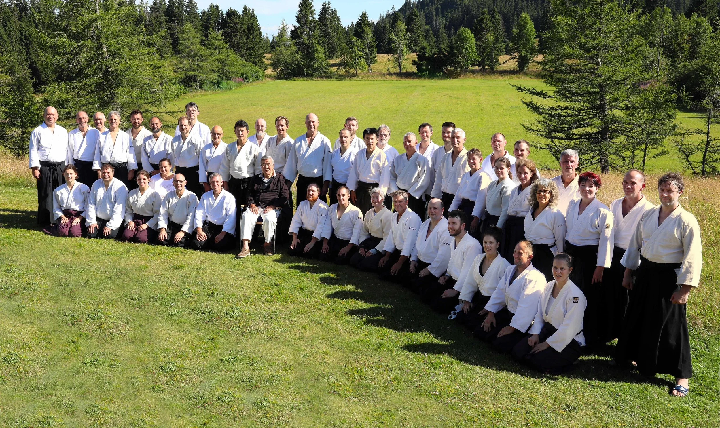 Die Teilnehmer des Aikido-Seminars 2. Woche Herzogenhorn mit Shimizu Sensei (sitzend) und Wakasensei Kenta Shimizu in der Mitte.. Foto: Gaelle Hemkemeier